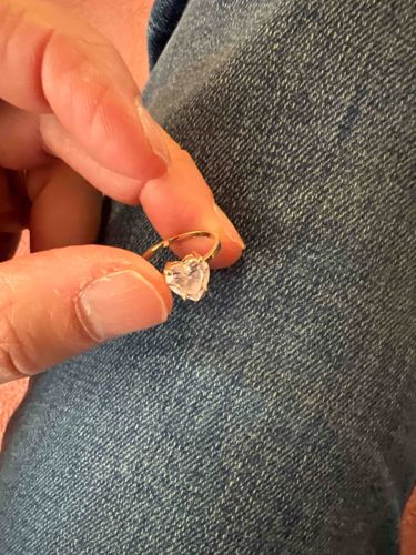 This item is a decorative solitaire ring featuring a large, heart-cut clear gemstone centerpiece. The central stone is held in a three-prong basket setting, with the metal exhibiting the warm yellow tone characteristic of 10k or 14k yellow gold or a high-quality gold plating. The gemstone appears to be a faceted clear stimulant, such as cubic zirconia or a high-grade glass, given its size and cut style. The band is a slender, polished round-shank design, typical of late 20th-century or contemporary romantic-style jewelry. The construction focuses on a minimalist aesthetic to highlight the central heart motif. Regarding its condition, the band shows minor signs of surface wear and superficial scratches consistent with gentle use. The stone exhibits good transparency with a high refractive index, though the prongs appear slightly thick, suggesting commercial-grade manufacturing rather than bespoke high-jewelry craftsmanship. No visible maker’s marks are discernible in the photograph. This style is often associated with bridesmaid jewelry, 'sweet sixteen' gifts, or fashion accessories from the 1990s through the present day. The overall craftsmanship is uniform and functional, prioritizing the sentimental appeal of the heart shape.