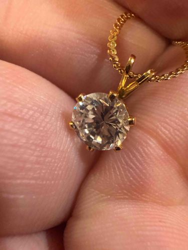 This piece of fine jewelry features a round brilliant cut colorless stone, likely a diamond, estimated at approximately 0.50 to 1.00 carat. The stone is secured in a classic six-prong setting made of yellow gold, which provides maximum security and emphasizes the circular silhouette of the gem. The pendant's bail is a traditional V-shape, allowing it to slide freely along an accompanying yellow gold curb link chain. The metal exhibits a high-polish finish with a warm yellow hue characteristic of 14k or 18k gold. Under close inspection, the stone shows good brilliance and fire, though a definitive grade would require loose stone examination. The setting appears to be in excellent condition with no visible signs of metal fatigue or prong thinning, suggesting a modern manufacturing era, likely within the last 20-30 years. The chain is fine but appears sturdy with a uniform weave. No visible maker's marks or hallmarks are present in the primary view, though they would typically be found on the clasp or the back of the bail. The overall construction displays professional jewelry craftsmanship with symmetrical alignment.