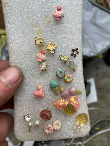 This is a miscellaneous collection of approximately twenty individual novelty stud earrings, currently mounted on a white polyethylene foam insert for display or storage. The collection features a variety of small-scale, whimsical designs crafted from inexpensive materials including cast resin, hard plastic, and base metals. The designs include dessert-themed items like cupcakes, glitter-sprinkled donuts, and ice cream cones, as well as several animals such as pink llamas and small enameled dogs. There are also floral motifs, a lone rhinestone stud, and faux pearls. The earrings appear to be mass-produced contemporary items, likely dating from the 2010s to the present. Many pieces feature glitter inclusions or vibrant painted surfaces to appeal to a younger demographic. Condition is fair to used; several pieces are missing their matching pairs, and there are visible signs of wear including surface grime, oxidation on the metal posts, and minor paint chips. The foam backing is soiled and shows signs of age, indicating these were stored in a non-protected environment. These represent typical low-cost mall-brand jewelry common in the fast-fashion market.