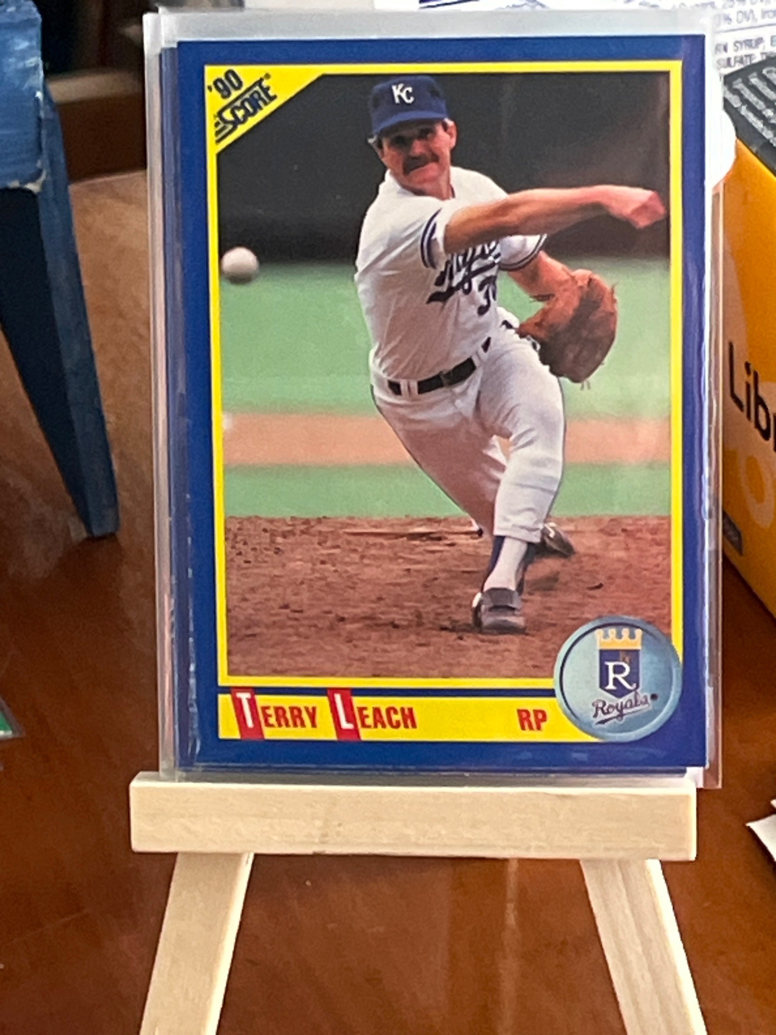 This is a 1990 Score brand baseball card featuring pitcher Terry Leach of the Kansas City Royals. The card is displayed in a protective clear plastic sleeve on a small wooden easel. The design features a distinctive blue border surrounding a inner yellow frame that contains an action photograph of Leach mid-pitch on the mound. In the upper left corner, there is a yellow diagonal flag with the '90 SCORE' logo. The player's name, 'TERRY LEACH', is printed in red block letters at the bottom, accompanied by his position 'RP' (Relief Pitcher) and a circular Kansas City Royals team logo in the bottom right corner. Physical characteristics include the standard 2.5 by 3.5-inch cardstock dimensions. The centering appears slightly heavy toward the left and top borders. The corners of the card within the sleeve appear sharp, which is a key quality indicator for cards from this 'junk wax' era. The printing quality shows the typical high-saturation colors of the 1990 Score set. There are no visible creases, surface scratches, or staining on the front face, suggesting a high state of preservation. The card is a mass-produced item from the early 1990s, characterized by high production volume which generally affects common players' market values.