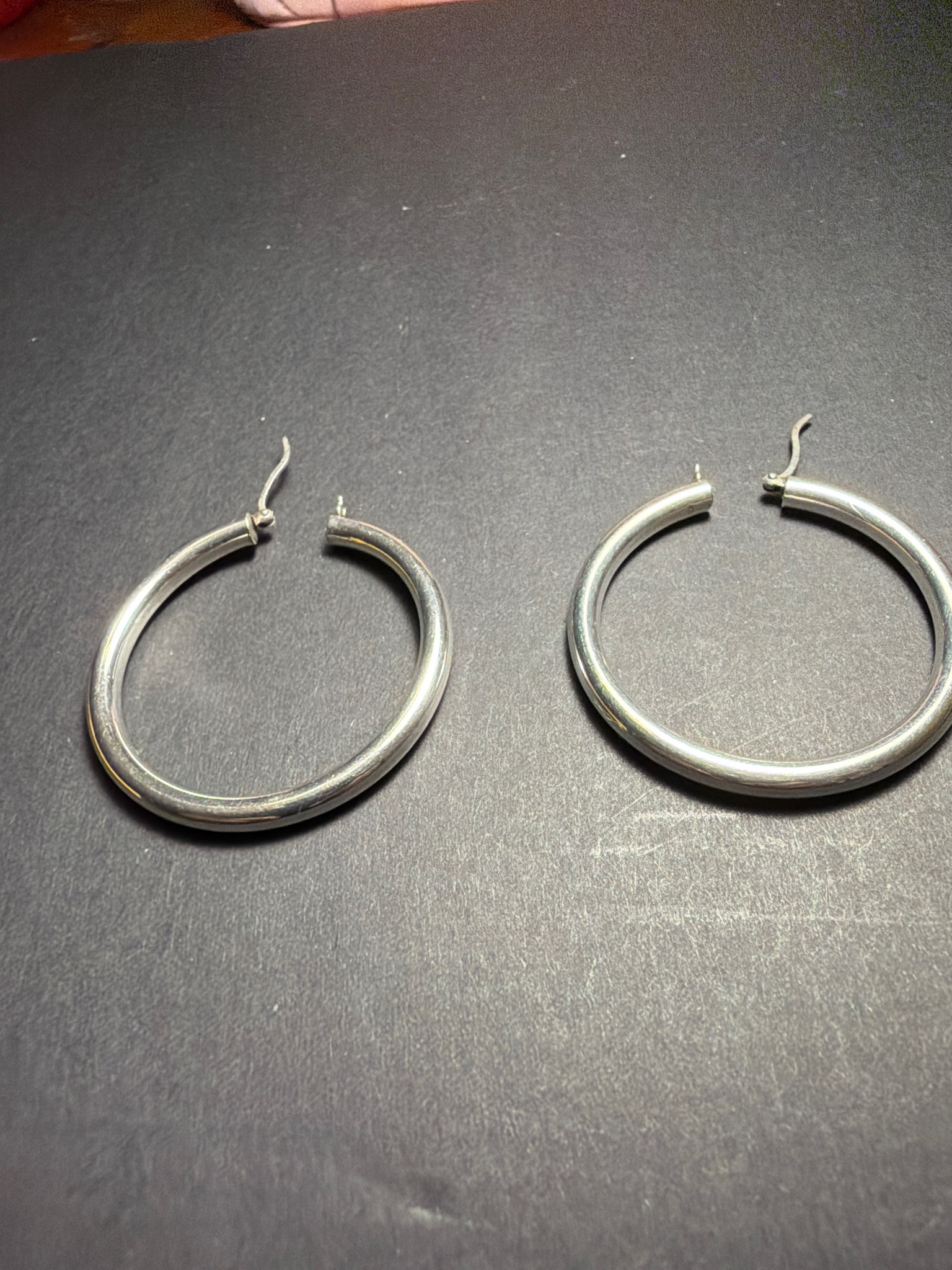 A pair of medium-to-large sized hoop earrings featuring a classic, high-polish silver-toned finish. These earrings belong to the continuous hoop style, constructed from lightweight hollow metal tubing, which allows for a substantial visual profile without excessive weight on the earlobe. The tubing has a circular cross-section with an approximate thickness of 3mm to 4mm. The closure mechanism is a hinged 'saddle' or 'snap bar' clasp, where a curved ear wire (post) clicks into a small notched catch on the opposite end of the tube. While no hallmarks such as '925' are clearly visible in the photo, the bright, white-silver luster is consistent with sterling silver or rhodium-plated base metal. The condition shows minor superficial scratches and a light patina typical of pre-owned jewelry, particularly near the hinge joints and the inner surface of the hoops. There are no signs of heavy denting, pitting, or structural failure. These earrings represent a timeless design commonly produced from the late 20th century to the present day, emphasizing a minimalist and versatile aesthetic suitable for both professional and casual wear.
