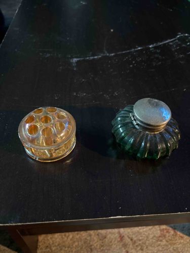 This item consists of two distinct components typically associated with a Victorian-era desk set or vanity. The primary piece is a green-toned, pressed glass inkwell featuring a heavily ribbed or gadrooned 'squat' circular body. It is topped with a metal hinged lid, likely made of pewter or a silver-toned alloy, showing a significant matte patina and surface oxidation characteristic of age. The glass exhibits a rich emerald or forest green hue. Accompanying the inkwell is a secondary clear glass insert, known as a flower frog or potentially a pen holder, featuring a series of circular cylindrical apertures. This secondary piece shows a warm, amber-toned discoloration, which may be a result of aged ink staining or the chemical composition of the glass reacting to light over time. The craftsmanship is indicative of mass-produced glass from the late 19th to early 20th century, where mold lines are often visible. Condition-wise, the metal hinge appears intact but weathered, and the glass surfaces show minor abrasions consistent with regular use. No specific maker's marks are visible in the image, but the style is consistent with American or European glassworks of the 1880-1910 period. The set displays a charming historical character with authentic wear patterns.