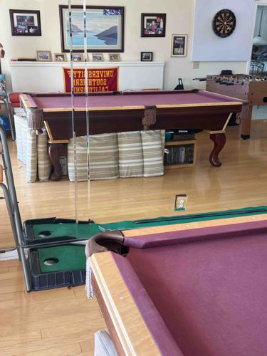 This is a regulation-style billiard table featuring a traditional furniture-grade design. The table is constructed with a dark mahogany-toned wood finish on the main apron and frame, accented by lighter wood rails, possibly maple or oak. It utilizes a three-piece slate bed covered in a distinctive burgundy (merlot) felt cloth. A notable feature is the classic queen-anne style cabriole legs, which add a touch of formal elegance to the piece. The corners are fitted with leather drop pockets adorned with decorative shield-style fringing. The top rails include inlaid diamond-shaped sights (pearlized or white plastic) used for aiming shots. The overall construction suggests a high-quality residential model, likely manufactured in the late 20th or early 21st century. The condition appears well-maintained, though some minor scuffing is visible on the wood finish near the base of the legs, and the felt shows typical signs of surface wear from play. The table is approximately 8 feet in length, which is the standard size for home game rooms. The craftsmanship is evident in the joinery of the frame and the contoured shaping of the legs, typical of mid-to-high tier pool table brands like Brunswick or Olhausen.