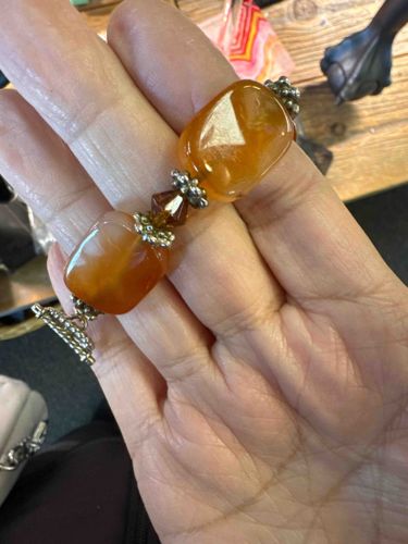 This handcrafted beaded bracelet features large, polished rectangle-shaped beads of carnelian or a similar semi-precious agate, displaying a rich, translucent honey-to-burnt-orange color profile with natural internal clouding. These primary beads are separated by a distinctive arrangement of decorative metal spacers and faceted crystal elements. Specifically, each large stone is flanked by textured, silver-toned floral or 'bali-style' bead caps. Between these caps sits a faceted, bicone-shaped amber crystal bead, which adds light-reflecting brilliance and a tonal contrast to the smooth stones. The bracelet is constructed on a flexible stringing material and secured with a textured toggle clasp, indicating a contemporary artisanal assembly. The metal components show a slight antiqued patina, typical of plated base metals or sterling silver-style finishes used in boutique jewelry. Total length appears to be standard for an adult wrist. The condition is excellent with no visible surface scratches on the stones or chips in the crystal bicones. Based on the assembly style and components, this piece likely dates from the late 20th century to the present day, reflecting a timeless, bohemian aesthetic with high-quality craftsmanship in the bead selection and symmetry.