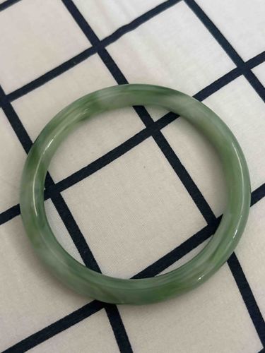 This item is a smooth, circular bangle bracelet, likely crafted from jadeite or nephrite jade, given its characteristic coloration and translucency. The primary color is a medium to light green, but it exhibits significant natural variations, including streaks, swirls, and patches of darker forest green, lighter sage green, and semi-translucent milky white. These color variations are typical of natural jade and contribute to its unique aesthetic appeal, indicating potential untreated material. The bangle has a consistent, rounded profile and a highly polished, lustrous surface that reflects light, suggesting good craftsmanship in its finishing. There are no visible chips, cracks, or significant abrasions discernable from the provided images, suggesting it is in very good condition. The uniformity of its circular shape indicates it was likely machine-cut and then hand-polished, or carefully carved to achieve its smooth finish. The precise measurements are not available, but it appears to be of standard wrist size. No specific maker's marks, signatures, or stamps are visible on the exterior surface. Based on its style and material, it likely dates from the 20th or 21st century, fitting into a classic jewelry aesthetic that has remained popular for centuries. The quality of the jade, as indicated by its luster and varied color patterning, suggests a valuable piece.