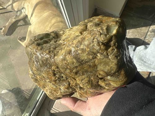 This specimen is a large, irregularly shaped raw boulder, likely nephrite or jadeite in its natural, uncut state. It exhibits a characteristic 'river stone' or water-worn texture with a smooth, waxy surface and significant pitting and crevices throughout the rind. The color palette is dominated by olive greens, earthy ochres, and deep brownish-rust tones, which suggest iron oxidation on the external 'skin' or cortex. In several translucent windows or recessed areas, a lighter sea-foam green core is visible, indicating potential gem-quality material beneath the weathered exterior. The piece measures several inches across, fitting broadly in a human palm, suggesting a significant weight and density. The condition is natural and unpolished, showing no post-recovery mechanical damage other than the geological wear consistent with alluvial deposits. The waxy luster and density are high-quality indicators for raw jade identification. There are no maker's marks, as this is a natural geological specimen, likely dating back millions of years in formation but recently sourced from a riverbed or mountain deposit.