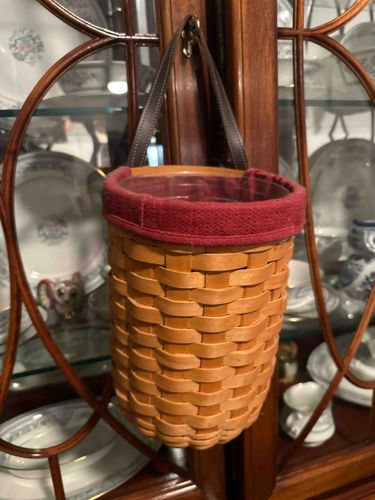 This is a hand-woven wood splint basket, identifying as a vintage Longaberger Tall Tissue basket, likely manufactured between the 1990s and early 2000s in Dresden, Ohio. The basket features a warm, honey-toned maple wood splint construction with a classic tight weave. It is cylindrical in shape, designed specifically to hold vertical tissue boxes or similar household items. Supporting the structure is a single, dark brown leather handle attached to the back, allowing it to be hung on a wall or doorknob. The top rim is accented with a burgundy red fabric fabric liner with a textured weave that overlaps the edge. Inside, a clear custom-fit plastic protector is visible, which serves to maintain the basket's shape and protect the wood from moisture or debris. The craftsmanship is indicative of Longaberger quality, showing uniform weaving and secure attachments. Condition appears Excellent to Like-New, with no visible breakage to the splints, staining on the fabric, or cracking in the leather handle. The leather retains a rich color with minimal stretching at the attachment points. While the bottom mark is hidden from view, these baskets typically feature an imprinted brand mark and the weaver’s initials on the underside.
