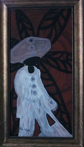 This original mixed-media painting features a stylized figure, likely a Pierrot or Harlequin character, dressed in a billowing white costume adorned with decorative blue rosettes. The figure is depicted with dark skin and wears a wide-brimmed white hat, set against a strikingly complex background of concentric, wood-grain-like red and black patterns and large, dark leaf-like silhouettes. The artwork is signed 'Gloria B. Sawyer' in the lower left quadrant of the figure's garment. The piece is housed in a contemporary, textured metallic frame with a champagne or pewter silver finish, featuring a tiered profile and a beaded inner border. The medium appears to be acrylic or oil with additional line-work detailing in the background. Proportionally, the work is vertically oriented with a narrow aspect ratio. The craftsmanship displays a blend of folk art and modern figurative styles, characterized by flat planes of color and high-contrast graphic elements. Based on the framing and materials, the piece likely dates from the late 20th to early 21st century. The condition appears sound with no visible foxing, cracking, or surface loss, though a minor scuff is noted on the lower left edge of the frame.