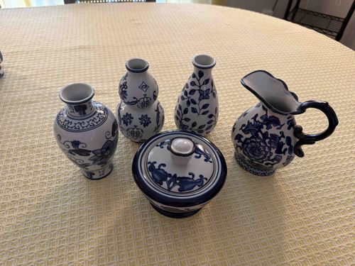 A five-piece collection of blue and white ceramic decorative items, specifically identified as products of The Bombay Company, manufactured in China. This set includes three distinct bud vases, a miniature pitcher, and a small lidded sugar or ginger jar. The items are crafted from porcelain with a bright white base glaze and classic cobalt blue underglaze transfers. The vase shapes include a traditional baluster form with floral panels, a double-gourd or hulu vessel featuring pomegranate and blossom motifs, and an ovoid vase decorated with climbing leaf patterns. The pitcher features a ruffled rim and an ornate, dark cobalt handle with traditional floral scrolling on the body. The lidded jar is round with a matching finial and horizontal banding. All pieces exhibit a high-gloss finish typical of late 20th-century mass-market Chinoiserie. The construction is uniform with smooth, machine-finished bases. Condition appears excellent with no visible chips, cracks, or heavy crazing, though light surface wear consistent with display use may be present on the foot rings. As contemporary reproductions of Ming or Qing dynasty aesthetics, these pieces represent the revival of traditional Chinese export styles marketed for Western home décor between the 1980s and early 2000s.