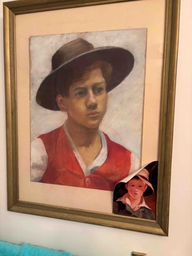 This item is a traditional bust-length oil portrait of a young man or boy, housed in a vintage gilded wood frame. The subject is depicted in a three-quarter view, wearing a broad-brimmed brown hat, a white collared shirt, and a vibrant red waistcoat or vest. The artistic style suggests an academic or realist approach typical of the late 19th to early 20th century. The brushwork is soft yet deliberate, especially in the facial features and the rendering of light on the skin. The background is a neutral, mottled greyish-white, which allows the red of the garment to stand out. The work appears to be executed on board or paper, as evidenced by a slight peeling or lifting at the bottom right corner, which reveals a secondary, smaller portrait of a younger child tucked behind it. The frame is a simple cove-style gilt frame with linear fluting, showing a moderate patina and minor abrasions consistent with age. There are no immediately visible signatures or maker's marks on the front surface. The overall condition shows some surface grime and potential darkening of the varnish, with the most notable issue being the detachment of the primary artwork from its original backing at the lower right quadrant.