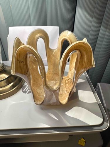 This item is a decorative hand-blown glass vase featuring a dramatic 'handkerchief' or 'fazzoletto' style, characterized by its deep, undulating folds that mimic the appearance of draped fabric. The vase is constructed from thick glass and exhibits a sophisticated 'scavo' or alabaster-like finish, blending creamy beige, tan, and light amber tones in a swirled, marbleized pattern. The exterior appears to have a matte or slightly textured finish consistent with 20th-century Italian glassmaking techniques, while the rim and interior suggest a smoother execution. Standing approximately 8 to 10 inches tall, the vessel is supported by a solid glass base. The piece showcases high-quality craftsmanship through the symmetry of its six large, vertical lobes and the organic flow of its color gradients. No visible chips, cracks, or significant repairs are noted in the provided image, though minor surface wear consistent with age may be present on the underside of the base. This style was popularized mid-century and remains a staple of Murano-influenced decorative arts.