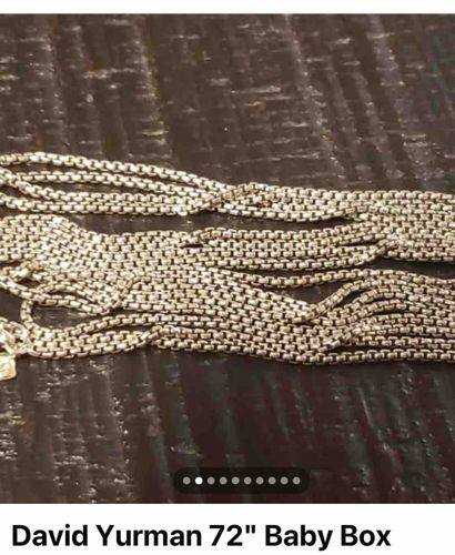 This is a luxury necklace designed by David Yurman, featuring the signature 'Baby Box' link style in sterling silver (.925). The piece measures an impressive 72 inches (approximately 183 cm) in length, allowing it to be worn as a long single strand, doubled, or tripled for a layered look. The construction consists of small, square-shaped interlocking links that create a fluid, continuous square-profile chain favored for its strength and refined industrial aesthetic. Each link is meticulously crafted, showcasing the high-quality craftsmanship typical of the Yurman brand. The silver exhibits a bright, polished finish with intentional oxidation visible within the crevices of the links to provide depth and contrast. A small metal hangtag is visible near the clasp area, which traditionally bears the 'D.Y.' logo and '925' purity stamps, though the fine details of the engraving are partially obscured in this view. The condition appears to be excellent with no visible kinks, broken links, or significant tarnish, maintaining the supple drape essential for such a long piece. This versatile accessory represents modern American luxury jewelry and is a staple of the David Yurman essentials collection.