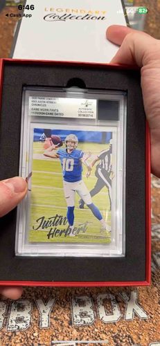 This is a premium sports memorabilia trading card featuring Los Angeles Chargers quarterback Justin Herbert, released as part of the 2020 Panini Chronicles collection. The central visual element is a full-color action photograph of Herbert in his blue and white Chargers uniform, poised to throw a football. Below the image, his name 'Justin Herbert' is prominently displayed in a stylized script font. The card is professionally encased in a rigid clear plastic protective slab, which is further housed in a custom-fitted black foam insert within a red presentation box. Above the card, a formal authentication label from 'Authentic Collection' specifies the item's provenance, noting the inclusion of a 'Game-Worn Pants' relic embedded within the card's construction. This piece is dated to his rookie season (2020), which significantly enhances its desirability among collectors. The label includes a unique certification number (2018630716) and a specific game-dated tracking number. The card appears to be in pristine condition, showing no visible surface scratches, corner softening, or edge chipping through the protective case. The 'Legendary Collection' branding is visible on the inner lid of the red box, indicating this was a high-end specialty release. The craftsmanship and presentation suggest a luxury tiered product designed for the sports investment market.
