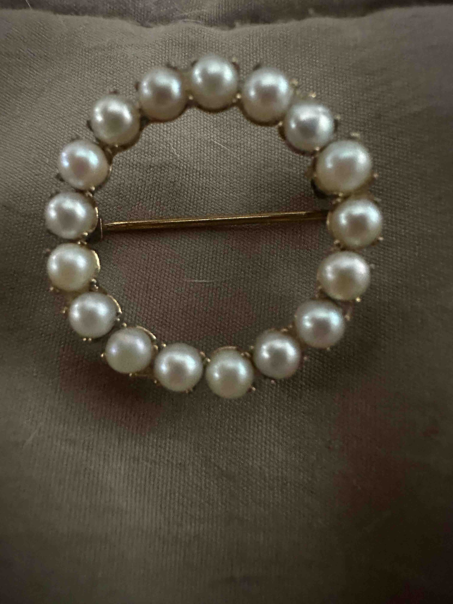 This is a vintage circular wreath-style brooch, approximately 1 to 1.5 inches in diameter, featuring a continuous row of 16 creamy white pearls. The pearls exhibit a soft, lustrous sheen with slight variations in surface texture, suggesting they may be cultured or high-quality glass simulations, common in mid-20th-century costume or fine jewelry. Each pearl is individually held within a yellow gold-toned metal setting, secured by delicate double prongs (four prongs per stone). The metal construction appears consistent with gold-filling or polished brass, showing a warm yellow hue. A horizontal pin bar with a classic hinge and safety C-clasp is visible behind the open-center frame. The craftsmanship is orderly and symmetrical, typical of the classicist revival styles popular in the 1950s and 60s. Overall condition appears good; however, there is a visible dark patina or tarnish where the prongs meet the pearls, and one pearl (located around the 10 o'clock position) shows slight surface abrasions. No maker’s marks are visible in the primary image, but the construction style is indicative of high-quality mid-century accessory production.