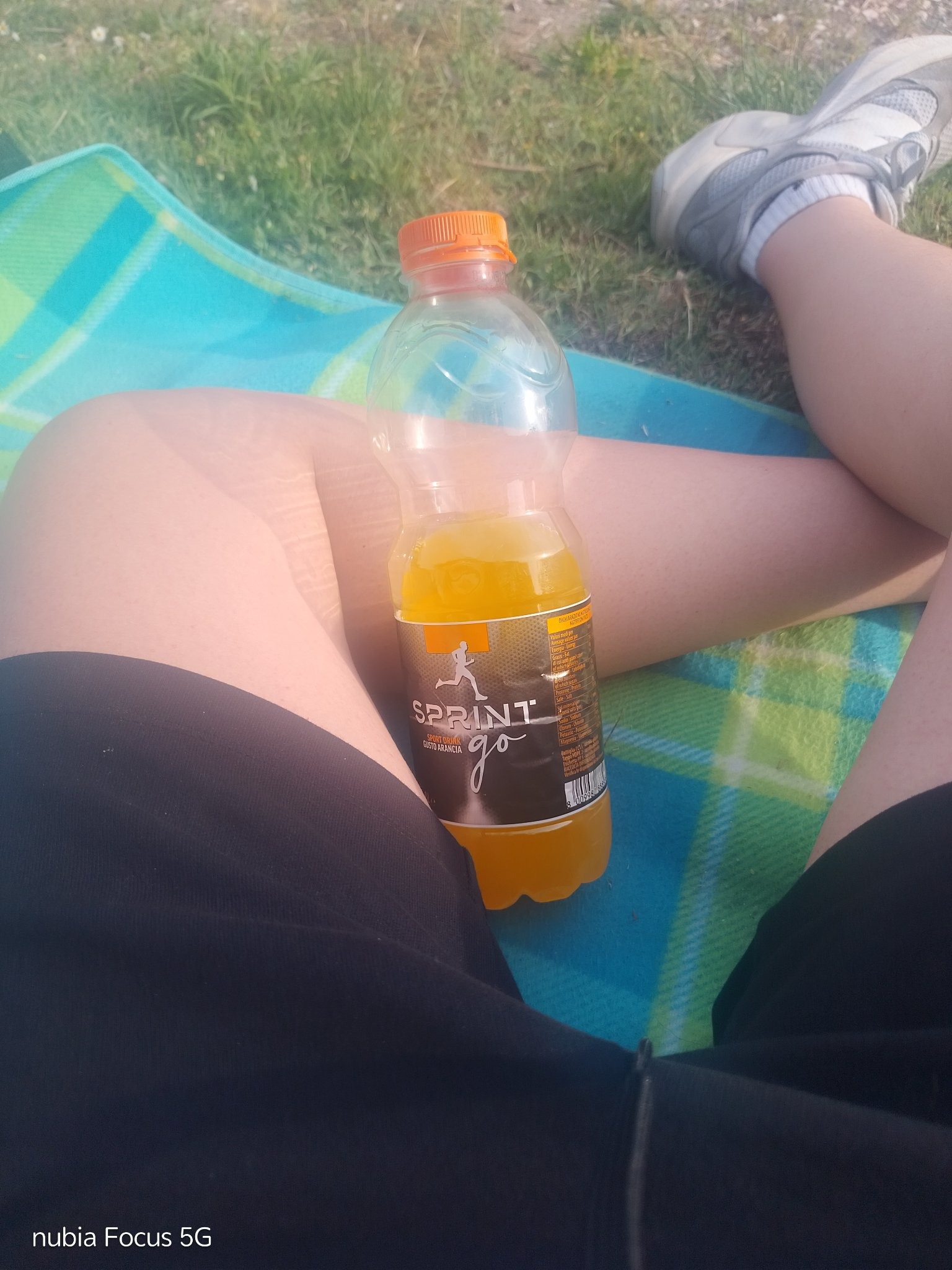 This is a single-use plastic bottle containing 'Sprint Go' brand sport drink, specifically the orange flavor ('Gusto Arancia') as indicated by the beverage's vibrant orange color. The container is a clear, contoured PET plastic bottle, approximately 500ml in size, featuring an ergonomic grip design with a textured upper section. It is sealed with a ribbed orange screw-top plastic cap. The label is wrap-around, featuring a dark brown or black background with white and silver typography. Notable graphics include a stylized silhouette of a runner, the brand name 'SPRINT' in bold serif font, and 'go' in a cursive script. A nutritional information panel and barcode are visible on the side of the label. The bottle appears to be roughly half-full and is in used condition, resting on a person's lap outdoors. There is minor condensation visible inside the upper portion of the bottle, suggesting it was recently chilled. The design and branding indicate a contemporary, mass-market consumer product likely manufactured within the last few years for the European retail market.