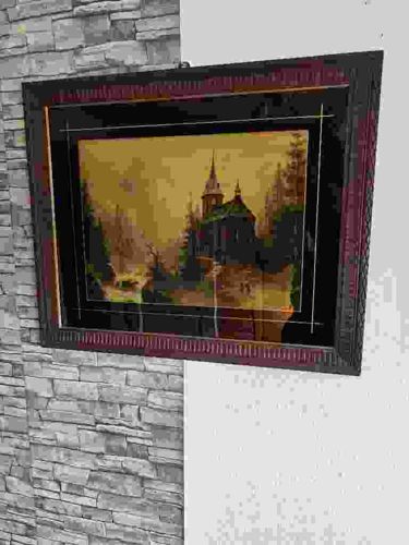 This item is a large, rectangular framed needlepoint or tapestry depicting a twilight or autumnal forest scene featuring a prominent Gothic-style church or chapel with a tall spire. The central artwork is executed with a warm color palette of ochres, deep greens, and browns, set against a hazy, golden sky. The craftsmanship indicates a significant time investment, with dense, textured stitching throughout the landscape and architectural elements. The artwork is professionally matted with a wide, black mat board accented by thin gold-toned filigree lines that draw the eye toward the center. It is housed in a substantial dark wood frame, likely stained walnut or mahogany with cherry undertones, featuring a fluted or 'reeded' decorative profile along the outer edge. The frame appears to be in good vintage condition, though there are minor scuffs visible along the lower right edge and corner. The assembly suggests a mid-20th-century decorative piece, possibly between 1960 and 1980, known for the popularity of hearthside and landscape needlework. No external signature is visible, suggesting it may be a high-quality hobbyist kit completion or an unsigned boutique piece. The overall presentation is formal and classic, suitable for traditional interior decor.