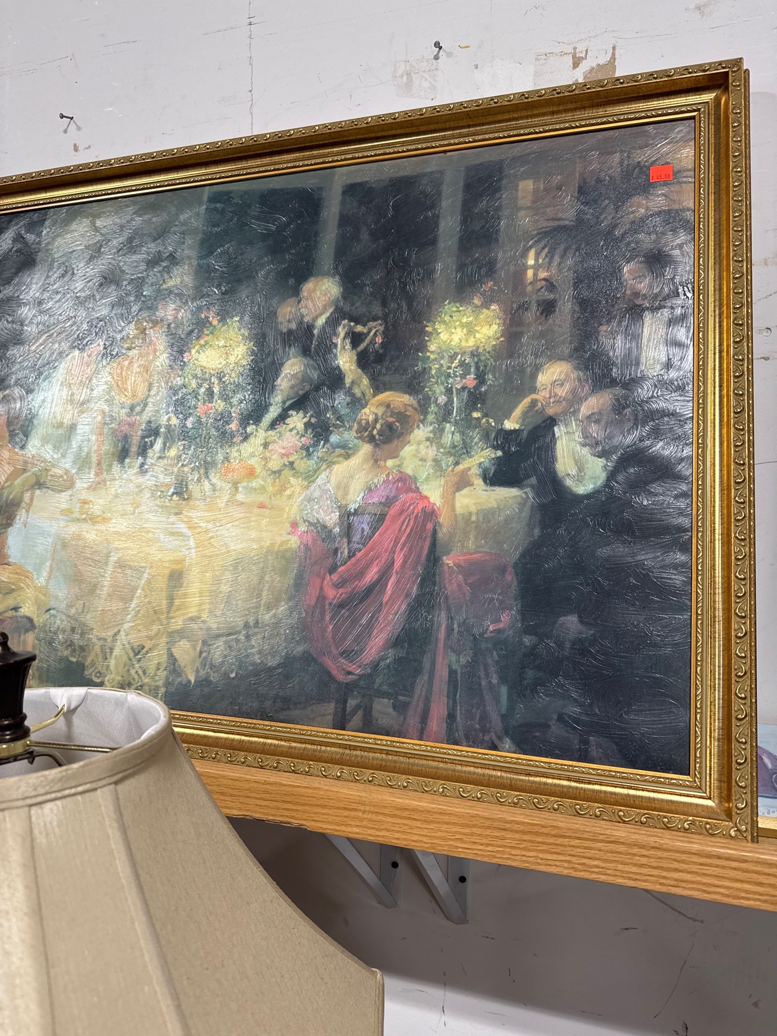 This item is a large-format reproduction print of the 1911 painting 'Un dîner mondain' by French artist Jules-Alexandre Grün. The piece is a textured print, likely a lithograph or giclée on board or canvas, featuring a heavy gloss varnish or clear gel medium applied with faux brushstrokes to mimic the appearance of an original oil painting. The scene depicts an elegant Belle Époque dinner party with figures in formal evening wear, characterized by a play of light from yellow floral centerpieces against a dark, atmospheric interior. The primary colors include deep blacks, muted yellows, and a striking red/pink shawl worn by the central female figure. The work is housed in a contemporary, decorative gold-toned wood or composite frame featuring ornate scrolls and beaded borders. Condition-wise, the print shows significant surface glare and visible dust accumulation. A red price tag is affixed directly to the print surface in the upper right corner, which may leave adhesive residue. The frame appears to be in fair condition with minor surface scuffs. This is a decorative home furnishing piece rather than an original fine art oil painting, likely dating from the 1980s to the early 2000s.
