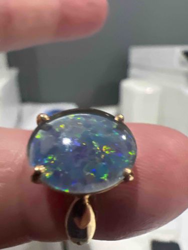 This is a fine jewelry ring featuring a prominent oval-cut black opal as its centerpiece, measuring approximately 11.7mm by 10mm. The opal exhibits a dark play-of-color with visible flashes of neon green, electric blue, and hints of orange-yellow against a deep body tone, characteristic of high-quality Australian black opals. The stone is secured in a four-prong setting crafted from 14k yellow gold, which provides a warm contrast to the cool tones of the gemstone. The band appears to be a classic, polished gold shank in a size 6.5. The craftsmanship indicates a minimalist solitaire style, likely dating from the late 20th century to the modern era, focusing purely on the natural beauty of the opal. The stone shows a smooth, high-domed cabochon cut with no immediate visible surface cracks or crazing, though a loupe would be required for a definitive structural assessment. The prongs are well-seated, though the lower-left prong shows slight wear consistent with regular use. The overall condition appears to be excellent for a vintage or pre-owned piece, with the gold maintaining a high luster and no significant abrasions to the table of the stone.