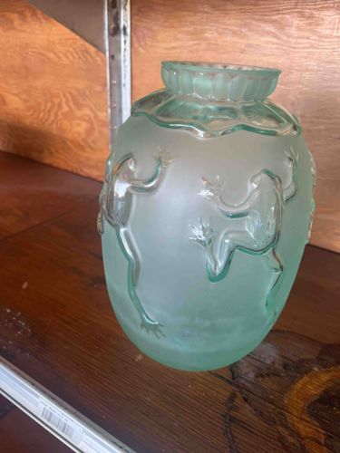 This is a sea-green or aquamarine tinted pressed glass vase, highly reminiscent of the 'Grenouilles' (Frogs) design originally conceived by René Lalique in 1930. The piece features an ovoid or egg-shaped body with a short, wide, scalloped or gadrooned neck. The primary design motif consists of multiple relief-molded frogs climbing or crawling across the exterior surface, executed in a frosted or acid-etched finish that contrasts with the smoother, translucence of the glass body. The color is a soft, muted pastel green characteristic of bohemian or French art glass from the early-to-mid 20th century. The construction displays high-quality molding with significant depth in the animal figures and a continuous, flowing pattern around the circumference. While no specific maker's mark is visible from this angle, the style is deeply Art Deco. Regarding condition, the vase shows some surface soot or dust, and there appears to be a minor scuff or surface abrasion on the lower right curve of the body. The rim appears intact without major chips, though a microscopic examination for 'flea bites' would be necessary for a full appraisal. The frosted finish shows a light patina consistent with age and display on a wooden shelf. This particular frog design is one of the most sought-after whimsical patterns in vintage art glass due to its anatomical detail and rhythmic composition.