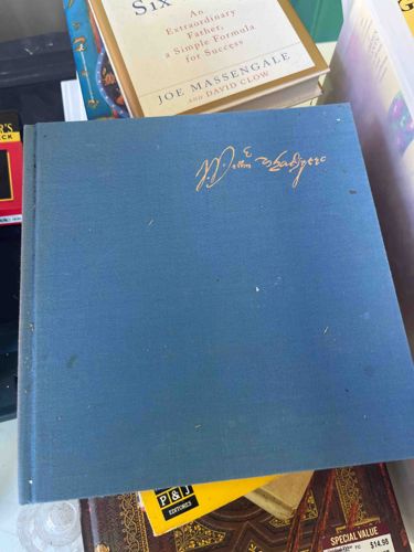 This is a large-format, hardcover art monograph featured in a distinct blue cloth binding. The book is square-bound and exhibits a textured fabric finish on the front board and spine. A defining aesthetic feature is the gold-foiled (gilt) reproduction of Pablo Picasso's stylised signature, which is positioned in the upper right quadrant of the front cover. The signature is intricate, rendered in a cursive script that serves as the primary decorative element on an otherwise minimalist cover. The dimensions suggest a comprehensive coffee-table style book, typically associated with major museum retrospectives. Regarding condition, the blue cloth shows visible signs of surface wear including light staining, minor particulate debris, and fading along the edges. There is noticeable scuffing on the corners and along the joint of the spine. Small white flecks appear on the surface, possibly from contact with other materials or minor paint transfer. The gilding of the signature appears largely intact though slightly dulled by age. This specific edition is most closely associated with the 1980 Museum of Modern Art (MoMA) exhibition catalog, though without the dust jacket. It represents a significant 20th-century publication documenting the breadth of Picasso’s career, characterized by high-quality binding materials intended for longevity in a library or private collection.