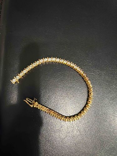 This is a classic 'tennis style' line bracelet featuring a continuous row of round-cut gemstones, likely diamonds, set in a yellow gold mounting. The piece is constructed with an estimated 50-60 individual articulated links, each possessing a four-prong basket setting that provides both security and light exposure for the stones. The metal displays a bright, high-polish yellow hue characteristic of 14k or 18k yellow gold. The stones appear to be round brilliant cuts with a consistent diameter across the entire length of the strand. The bracelet is fitted with a traditional box clasp mechanism, supplemented by a secondary figure-eight safety catch for added security. In terms of condition, the piece shows minor signs of wear consistent with moderate use, including light surface abrasions on the metal prongs and clasp. No missing stones are immediately visible. This style gained significant popularity in the late 20th century, specifically the 1980s, and remains a staple of modern fine jewelry. The craftsmanship suggests a quality commercial production, with uniform alignment of the settings and a fluid, flexible movement in the linkage. While no hallmarking is visible in this orientation, such pieces typically feature a fineness mark (e.g., '14K' or '585') on the tongue of the clasp.