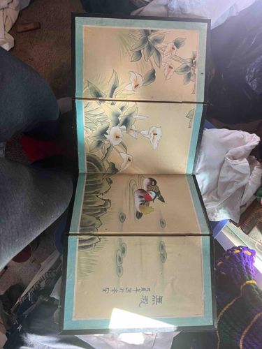 This item is a small four-panel folding screen, likely of East Asian origin (indicated by the calligraphy and artistic style), designed as a decorative tabletop or partition piece. The screen features hand-painted scenes across the panels, including floral motifs like calla lilies and aquatic birds, specifically mandarin ducks which often symbolize fidelity. The panels are framed in a dark, likely lacquered wood or synthetic dark-finished material. The background of the artwork has a muted golden or buff tone with a pale blue-green border framing each individual paper or silk panel. The bottom panel includes vertical calligraphy characters providing a poetic or descriptive context to the work. In terms of condition, there is visible wear along the hinges where the panels meet, and minor scuffing on the dark outer frame. The internal artwork shows some localized discoloration and slight creasing typical of age-related paper or silk degradation. The construction uses metal hinges to connect the four sections, allowing it to stand in a zigzag configuration. This piece appears to be a mid-to-late 20th-century decorative item, possibly a souvenir or a mass-produced traditional-style domestic decor piece, given the quality of the finish and the standard framing style. The craftsmanship shows a mix of printed elements and hand-applied color details, a common technique for mid-market Asian export art.