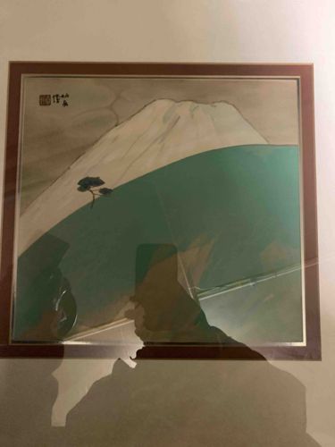 This artwork is a modern Japanese Nihonga-style painting attributed to Takeuchi Seihō (1864–1942), an influential figure in the Kyoto school of painting. The composition depicts a stylized, snow-capped Mount Fuji rising behind a sloping green foreground, likely representing a pine-covered ridge given the silhouette of a solitary tree on the left. The artist uses a subdued palette of off-white, forest green, and earthy ochre tones in the sky, showcasing the 'wash' technique characteristic of Nihonga on paper or silk. In the upper left corner, the piece features a clear artist's signature (hanko) and a square cinnabar red seal, which are critical for authentication. The construction appears to be ink and color on paper, professionally matted with a dark border and housed under glass within a square-format frame. The style reflects Seihō's fusion of traditional Japanese techniques with subtle Western influences in light and perspective, a movement he pioneered during the Meiji and Shōwa periods. The condition of the artwork appears generally good, though there is a faint horizontal line visible in the lower third that may be a minor crease in the paper or a reflection on the glass. The mounting is modern, with no obvious signs of water damage orfoxing visible in the current image. The execution demonstrates high-quality brushwork, particularly in the soft gradation of the mountain's slope and the delicate rendering of the single pine tree.