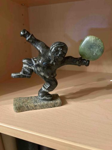 This is a hand-carved soapstone sculpture depicting an Inuit drum dancer in a dynamic, expressive pose. The figure is captured in mid-motion, balanced on one leg with the other raised, showcasing the fluid artistry often found in contemporary Arctic sculpture. The primary body is carved from a dark, charcoal-grey to black soapstone with a polished finish that reveals light grey natural veining and mottling. The dancer is holding what appears to be a stone drum or 'qilaut,' crafted from a contrasting light green stone, possibly serpentine or jadeite. This green stone disk is circular and polished, attached to the figure's outstretched hand. The figure's attire includes a traditional parka and boots (kamiks), with delicate incised lines representing the stitching and texture of the animal hides. The sculpture is mounted on a textured, rectangular base made of a lighter, brownish-grey speckled granite or hard stone. Condition-wise, the piece appears well-preserved, though there are visible white surface scuffs and minor scratches consistent with the soft nature of soapstone. No major chips or breaks are immediately apparent. The craftsmanship reflects a late 20th-century style, likely Canadian Arctic in origin, characterized by a blend of realistic subject matter and stylized, energetic movement.