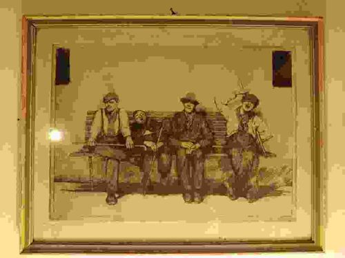This item is a framed monochrome print, likely an etching or lithograph, depicting four working-class men seated on a bench. The scene is rendered in sepia-toned or dark inks on an off-white or cream-colored paper. The figures are captured in a candid, social-realist style reminiscent of early 20th-century European or American art, possibly within the late 1920s to 1940s. The men are dressed in period clothing including flat caps, fedoras, suspenders, and structured coats. The composition centers on the figures against a sparse background, with two dark rectangular shapes (possibly windows or archways) flanking the subjects. The artwork is housed in a wooden frame with a metallic (possibly gold-leaf or gilt) finish and a stepped profile. The piece includes a large mat board that separates the print from the frame. Visible condition characteristics include signs of aging such as light foxing or yellowing of the paper, and some wear to the frame edges including minor scuffs and finish loss. The craftsmanship suggests a professional production, though specific artist signatures or maker's marks are not clearly legible at this resolution without closer inspection of the bottom margin. The use of light and shadow indicates a high level of detail in the original plate or stone used for printing.