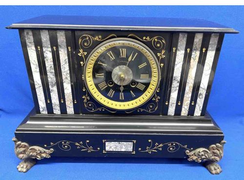 This is a substantial mantel clock, likely dating from the late 19th to early 20th century, characterized by its Neo-Classical or French Empire style influences, often associated with Marti movements. The clock features a rectangular, architectural case made primarily of black slate, providing a solid and imposing presence. The front facade is elegantly adorned with contrasting grey and white veined marble panels, set vertically and interspersed with polished black slate strips. Each slate strip features small brass or gilded studs, adding a decorative element. The central clock face is round, dark-colored (likely black or dark blue enamel), with Roman numerals VI through XII clearly visible, indicating it's a 12-hour dial. The numerals and hands appear to be gilded. A prominent golden, possibly brass, bezel with an intricate textured or beaded edge frames the dial. Elaborate gold scrolling and floral motifs, possibly hand-painted or stenciled, flank the clock face and adorn the lower base. The flat top and base are also black slate. The base rests on four ornate, cast metal feet, detailed with what appear to be lion's or mythical beast's paws and heads, showing some patina consistent with age. There is a small rectangular cartouche on the front base, also made of veined marble, possibly for an inscription or plaque. The overall condition appears good with minor wear consistent with its age, such as some surface scuffs on the slate and possible tarnishing on the metal elements. The craftsmanship is indicative of a quality ornamental timepiece.