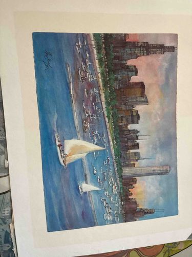 Chicago Skyline Watercolor Painting with Monroe Harbor