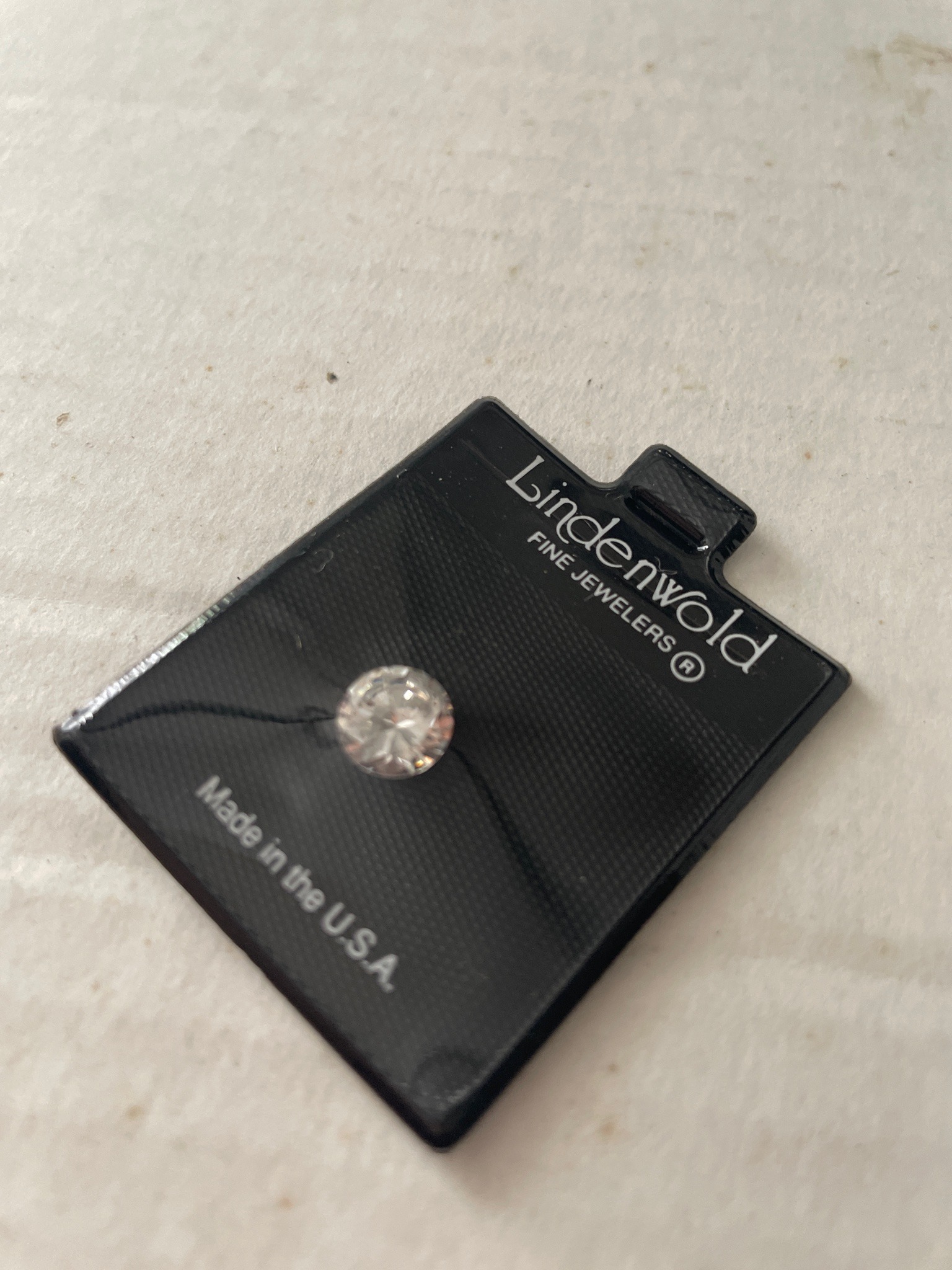This item is a loose, brilliant-cut clear gemstone, identified by the packaging as a Lindenwold Fine Jewelers product. Lindenwold is well known for producing high-quality simulated diamonds, typically made of cubic zirconia. The stone is round-cut with professional faceting that mimics the fire and brilliance of a natural diamond. The physical characteristics indicate a small-to-medium carat weight equivalent, securely attached to its original retail display card. The card is black plastic with a textured finish, featuring the 'Lindenwold Fine Jewelers' logo in white text in the upper right corner and the 'Made in the U.S.A.' designation at the bottom. The gemstone is held in place by a thin, dark filament or wire that suggests it is intended for secondary market sale or wholesale distribution. Regarding condition, the stone appears clean and clear with no visible inclusions or surface scuffs, and the packaging shows minor surface wear but no major cracks or damage. Based on the branding, this piece likely dates from the late 20th century to the early 21st century. The craftsmanship of the cut is consistent with commercial-grade simulated jewelry intended for high-end boutique styling.