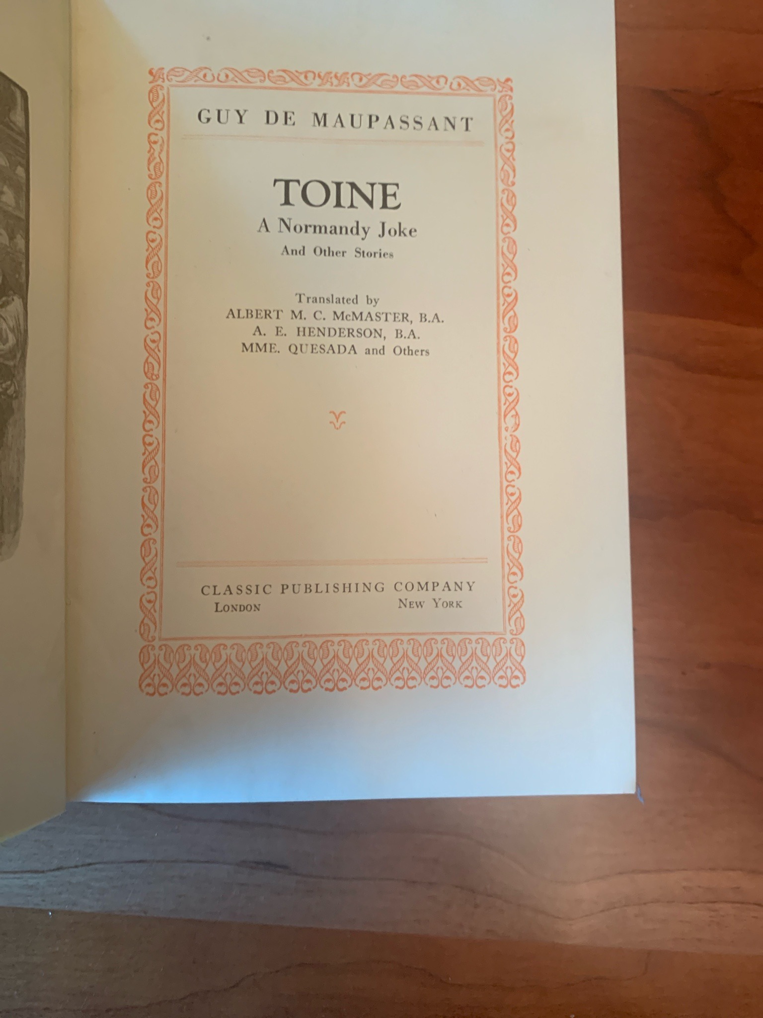 This is a vintage hardcover edition of 'Toine: A Normandy Joke and Other Stories' by the renowned French author Guy de Maupassant. The book features a title page with an ornate orange decorative border composed of intricate scrollwork. The text identifies the translators as Albert M. C. McMaster, B.A., A. E. Henderson, B.A., Mme. Quesada, and others. It was published by the Classic Publishing Company with offices listed in London and New York. While a specific publication year is not visible on this page, the typography and border design reflect a style common in the early 20th century, approximately 1910–1930. The paper appears to be an off-white or cream-colored heavy stock with light natural tanning around the edges due to age. A small orange floral fleuron is centered in the lower half of the framed text area. The gutter shows a portion of an illustration on the facing page, suggesting the book may be a multi-volume set or an illustrated edition. The condition appears well-preserved for its age, with sharp edges on the interior page and no significant foxing or tearing visible on the title leaf, though there is a Slight shadow casting over the bottom left which may indicate a standard page curl or bindery trait.