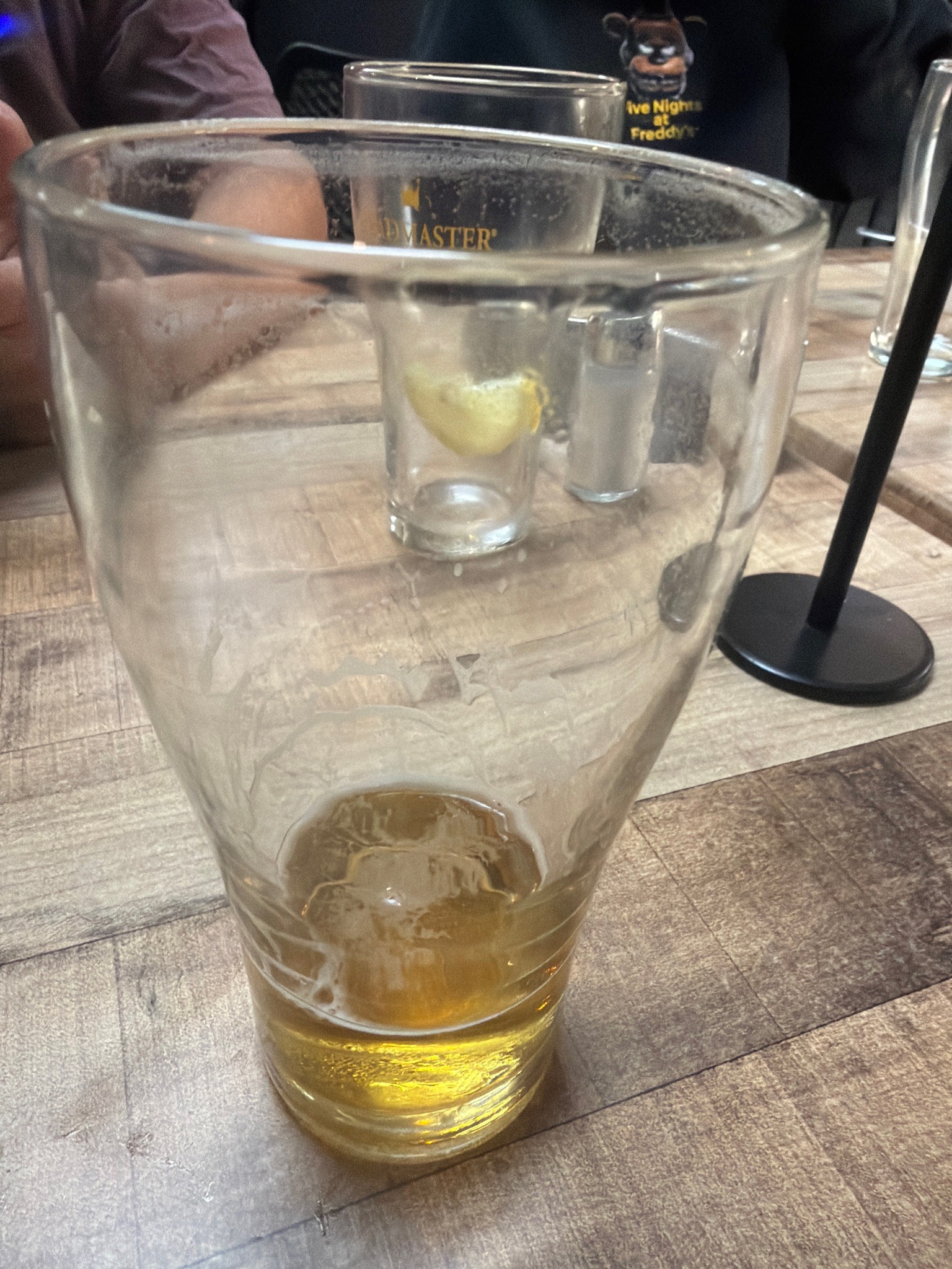 This is a standard 16-ounce (approximate) conical-style pint glass, commonly referred to as a Shaker glass. It is constructed from clear, thick-walled soda-lime glass with a weighted base designed for stability in a commercial bar or restaurant environment. The glass features a wide mouth that tapers uniformly down to a narrower circular base. Currently, the item is in a used state, containing a small amount of amber-colored liquid—likely lager or ale—at the bottom, with visible condensation and lacing (foam residue) clinging to the interior walls. While the glass appears free of major chips or structural cracks, there is noticeable cloudiness and water-spotting typical of high-frequency commercial dishwashing, indicating a lack of professional polishing. In the background, a similar glass features a 'HEADMASTER' branding mark in gold-tone lettering, suggesting these may be part of a bulk commercial set. The craftsmanship is utility-grade, mass-produced for durability rather than artisanal value. Such glassware is ubiquitous in mid-20th century to contemporary hospitality settings and lacks unique individual markers.