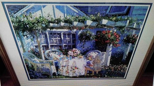 This item is a framed fine art print, likely a lithograph or serigraph, depicting a romanticized, impressionistic garden scene by the artist H. Gordon Wang. The composition features an outdoor patio setting with three white wicker armchairs gathered around a table draped in a floral cloth. A vibrant trellis covered in green foliage and red flowers provides dappled shade across the scene. The color palette is dominated by cool blues, purples, and whites, contrasted by naturalistic greens and floral reds, creating a serene, sun-drenched atmosphere. The print is professionally matted with a double mat board—a white inner mat and a wider textured or off-white outer mat—and is housed in a traditional wooden frame with a gold-tone inner fillet. Based on the style and typical production of Wang’s work, this piece likely dates from the late 20th century to early 2000s. The artwork demonstrates the artist’s characteristic use of light and texture through broken brushstrokes. The condition appears to be good with no visible foxing, water damage, or significant fading, though some minor scuffing on the wooden frame edges is typical for its age. The print quality suggests a high-end commercial reproduction intended for interior design and residential display.