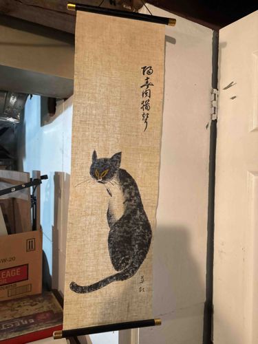 This item is a decorative vertical hanging wall scroll featuring a stylized black and white cat. The artwork is executed on a rectangular piece of coarsely woven textile, likely burlap or a similar natural jute fiber, giving it a distinctive rustic texture. The cat is depicted in a seated position facing away from the viewer, looking over its shoulder with yellow-rimmed eyes. The artistic style mimics traditional East Asian brushwork with a dappled or salt-and-ink effect on the fur. At the top right, there are vertical calligraphic characters in black ink, and a small red artist's seal or stamp is visible at the bottom right near the cat's tail. The fabric is mounted between two black wooden or plastic rods with gold-toned metallic end caps. Condition-wise, the edges of the scroll fabric appear raw and slightly frayed, which may be part of the intentional aesthetic. The substrate shows natural irregularities in the weave and color. Based on the materials and construction, this piece appears to be a mid-to-late 20th-century decorative item rather than an antique, possibly intended for the souvenir or home decor market.