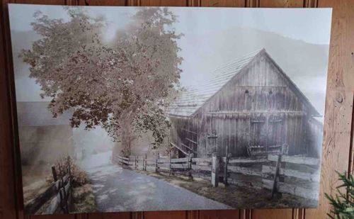 This item is a rectangular canvas print featuring a monochrome or desaturated sepia-toned landscape. The scene depicts a rustic wooden barn with a prominent gable roof, situated beside a narrow path or road that recedes into a misty background. A large, leafy tree dominates the left-center of the composition, its foliage blending into the foggy atmosphere. A weathered wooden post-and-rail fence runs along the roadside and barn perimeter, enhancing the rural aesthetic. The color palette is minimal, consisting of varied shades of grey, charcoal, and muted tan, which creates a somber and nostalgic mood. The print appears to be a gallery-wrapped canvas, as no external frame is visible, and the image seemingly continues to the edges. Based on the uniform texture and modern printing style, this is likely a contemporary decorative piece manufactured within the last 10-15 years. The condition appears fair to good based on the photo; however, the lack of a frame may expose the corners to potential fraying or scuffing over time. No artist signature or maker's marks are visible on the front surface. The craftsmanship is typical of high-volume commercial art intended for home decor.