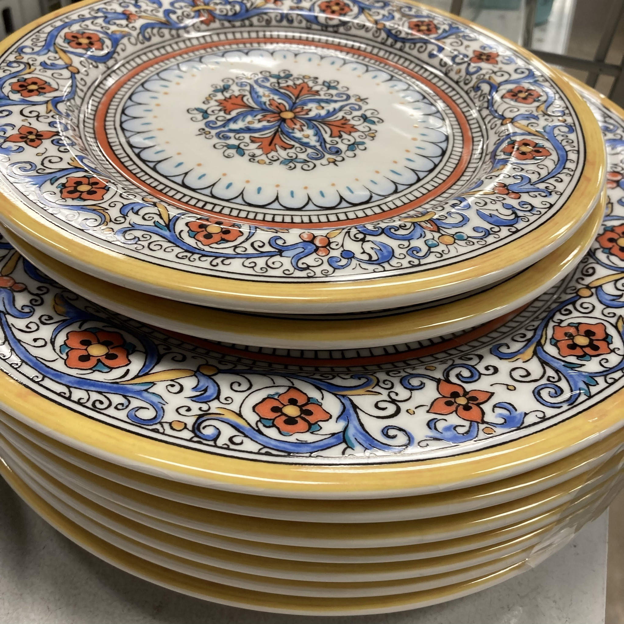 This set of ceramic dinner plates features a vibrant decorative design inspired by traditional Iznik and Mediterranean pottery styles. The color palette is dominated by a bright yolk-yellow rim, accented by intricate patterns in cobalt blue, terracotta orange, and black outlining on a crisp white ground. The central well of the plate displays a complex floral medallion, surrounded by a scalloped border and a wide rim decorated with scrolling foliage and stylized blossoms. Constructed from durable, heavy-weight earthenware or stoneware, these plates exhibit a glossy glaze finish that enhances the saturation of the pigments. As a contemporary product from World Market, they replicate hand-painted artisanal aesthetics through modern decal or transfer printing techniques, evidenced by the uniformity of the repeat patterns. The edges are rounded and thick, indicative of everyday functional tableware. The condition appears to be excellent and 'new-with-tags,' as some plates remain wrapped in original retail plastic film. There are no visible chips, cracks, or crazing, and the glaze remains highly reflective with no signs of utensil wear or fading. The craftsmanship reflects mass-market quality intended for high durability and casual dining.