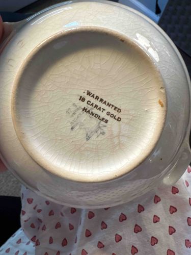 This is a vintage glazed ceramic vessel, likely a serving bowl or tureen, exhibiting several distinctive characteristics indicative of mid-20th-century production. The ceramic body is a creamy off-white, featuring an unglazed foot rim. A defining physical characteristic is the heavy crazing or 'crackolure' pattern visible throughout the glaze on the underside, which occurs when the glaze and ceramic body expand or contract at different rates. The item features integrated handles, though their full shape is partially obscured. Notable markings on the base include a black stamp reading 'WARRANTED 18 CARAT GOLD HANDLES,' indicating the application of genuine gold gilding to the handle areas. Below this is a faint, circular manufacturer's mark for 'CARLES CHINA,' suggesting European or American manufacture from roughly the 1940s to 1960s. Condition issues include the aforementioned extensive crazing, light brownish staining/discoloration caught in the cracks (often called glaze staining), and minor pitting or surface wear consistent with age and domestic use. The presence of the '18 Carat Gold' warrant serves as a quality indicator for the era, signaling a piece intended for formal dining or decorative display.