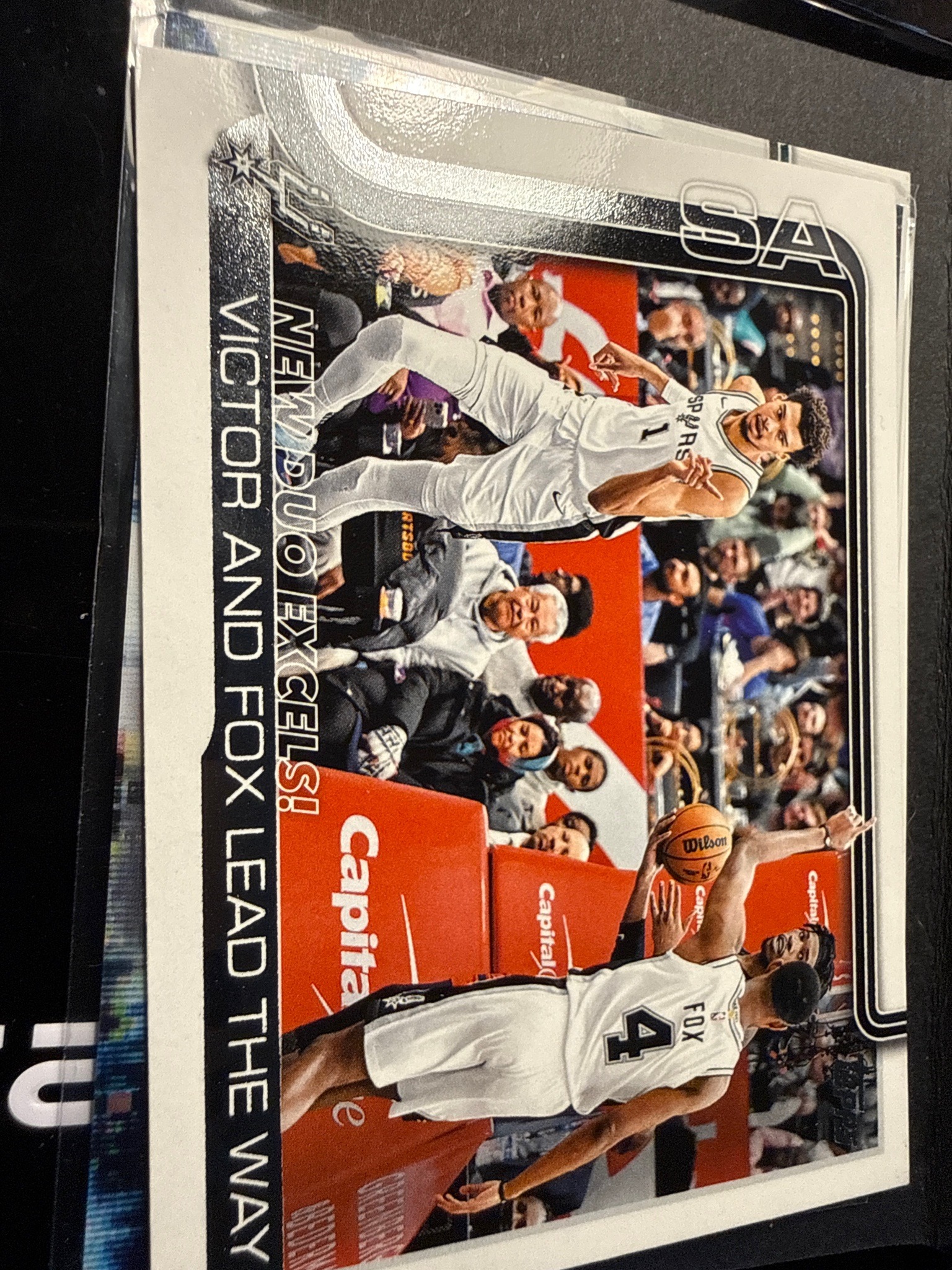 This is a modern sports trading card featuring Victor Wembanyama (number 1) and another player labeled 'Fox' (identified as Jamaree Bouyea based on the San Antonio Spurs roster and jersey number 4). The card is oriented horizontally with a landscape action shot of both players in their white Spurs home uniforms. The design features a bold black and white border on the left side with vertical text reading 'NEW DUO EXCELS! VICTOR AND FOX LEAD THE WAY'. In the top right corner, a stylized 'SA' logo for San Antonio is visible. The background shows an out-of-focus crowd and red 'Capital One' court-side branding. The card appears to be printed on standard glossy cardstock and is currently housed in a clear plastic protective sleeve. Regarding condition, the card exhibits relatively sharp corners, though there is a slight centering bias toward the right edge. No major creases or surface scratches are immediately visible through the sleeve, though the top edge shows some minor roughness likely from the factory cutting process. This item represents a 'duo' insert or subset card from the 2023-2024 NBA season, marking Wembanyama's highly anticipated rookie year.