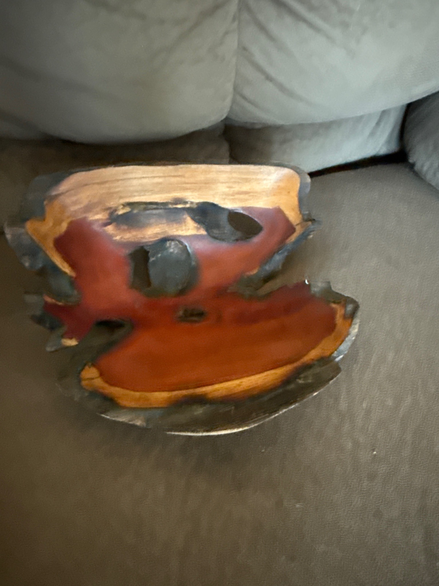 This item is a sculptural decorative bowl hand-carved from a single piece of natural burl wood, likely teak or redwood based on the rich coloration. The piece features a striking 'live edge' aesthetic, retaining the dark, rugged exterior bark which contrasts sharply with the smooth, polished interior. The interior showcases three distinct concentric bands of color: a deep reddish-brown core, a vibrant golden-orange mid-tone, and a lighter sapwood trim near the rim. Notably, the bowl incorporates several organic voids or 'natural inclusions' where the wood grain was naturally hollow, adding to its unique asymmetric character. The craftsmanship suggests a mid-to-late 20th-century artisan execution, characterized by a high-gloss finish that highlights the complex swirling grain patterns. The condition appears fair to good; there is visible cloudiness in the finish on the upper interior wall, suggesting possible oxidation, moisture exposure, or UV damage to the lacquer. The structural integrity remains intact with no apparent stability-threatening cracks outside of the natural wood pores. Its abstract, shell-like form and organic silhouette reflect the organic modernism movement, prioritizing the natural beauty of the raw materials over formal geometric symmetry.