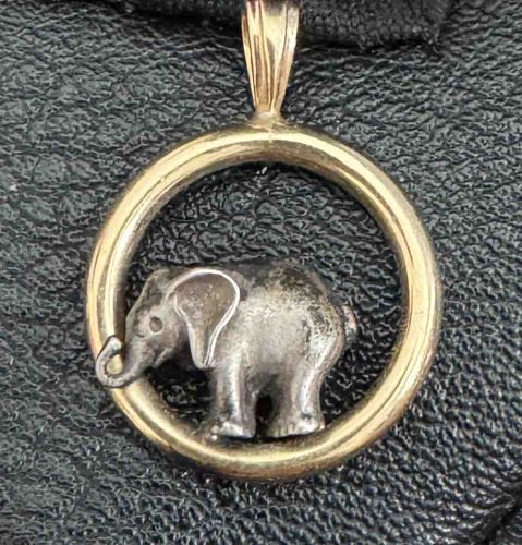 This pendant features a charming two-tone design, showcasing a central elephant figure enclosed within a circular frame. The circular frame and the attached bail are crafted from a yellow-tone metal, likely gold or gold-plated sterling silver, while the elephant itself is made from a contrasting silver-toned metal, possibly sterling silver or pewter. The elephant is depicted in a standing profile with its trunk raised in a classic 'lucky' position and features textured detailing on the body and ears. Measuring approximately 20-25mm in diameter, the pendant exhibits a polished finish on the yellow metal ring and a more matte, slightly antiqued finish on the elephant figurine. Regarding condition, the piece shows visible signs of age and wear. The silver-toned elephant exhibits significant surface oxidation and dark patination, particularly in the recessed areas of the casting. The yellow metal frame shows minor surface abrasions and light scratches consistent with regular handling and contact with other jewelry. The craftsmanship is cast, with the elephant figure securely soldered to the bottom interior of the ring. While no specific maker's marks or fineness stamps are visible in this view, the style is reminiscent of mid-to-late 20th-century novelty jewelry. The bail is a standard tapered design, integrated seamlessly onto the top of the circular frame, and appears sturdy and functional for use with a fine jewelry chain.