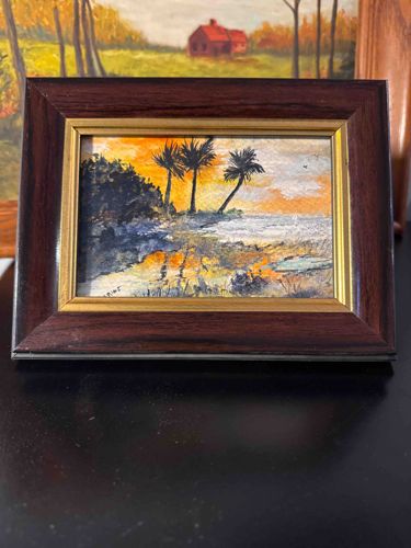 This item is a small-form miniature painting, likely oil or acrylic on board or heavy paper, depicting a coastal scene during a vibrant sunset. The composition features three prominent palm trees silhouetted against a brilliant orange and yellow sky, with deep purple and black foliage concentrated on the left side of the frame. The foreground shows a shoreline with reflective water, masterfully captures the warm hues of the sky in ripples. The artwork is housed in a polished, deep mahogany-tone wooden frame with a gold-colored inner fillet that adds a classic, formal aesthetic despite the small size. Measuring approximately 4x5 inches including the frame, the piece exhibits impressionistic brushwork and a thick application of pigment in some areas. A small signature or marking is partially visible in the lower-left corner, though it is difficult to decipher without magnification. The condition appears excellent with no visible cracks, foxing, or fading of the pigments. The frame shows minimal signs of wear with a smooth, glossy finish. Given the style and framing, it appears to be a contemporary take on classic seascape art, possibly from the late 20th to early 21st century. The craftsmanship is high, evidenced by the balance of color and the use of the 'cloth-like' texture of the substrate which adds depth to the sky and water.