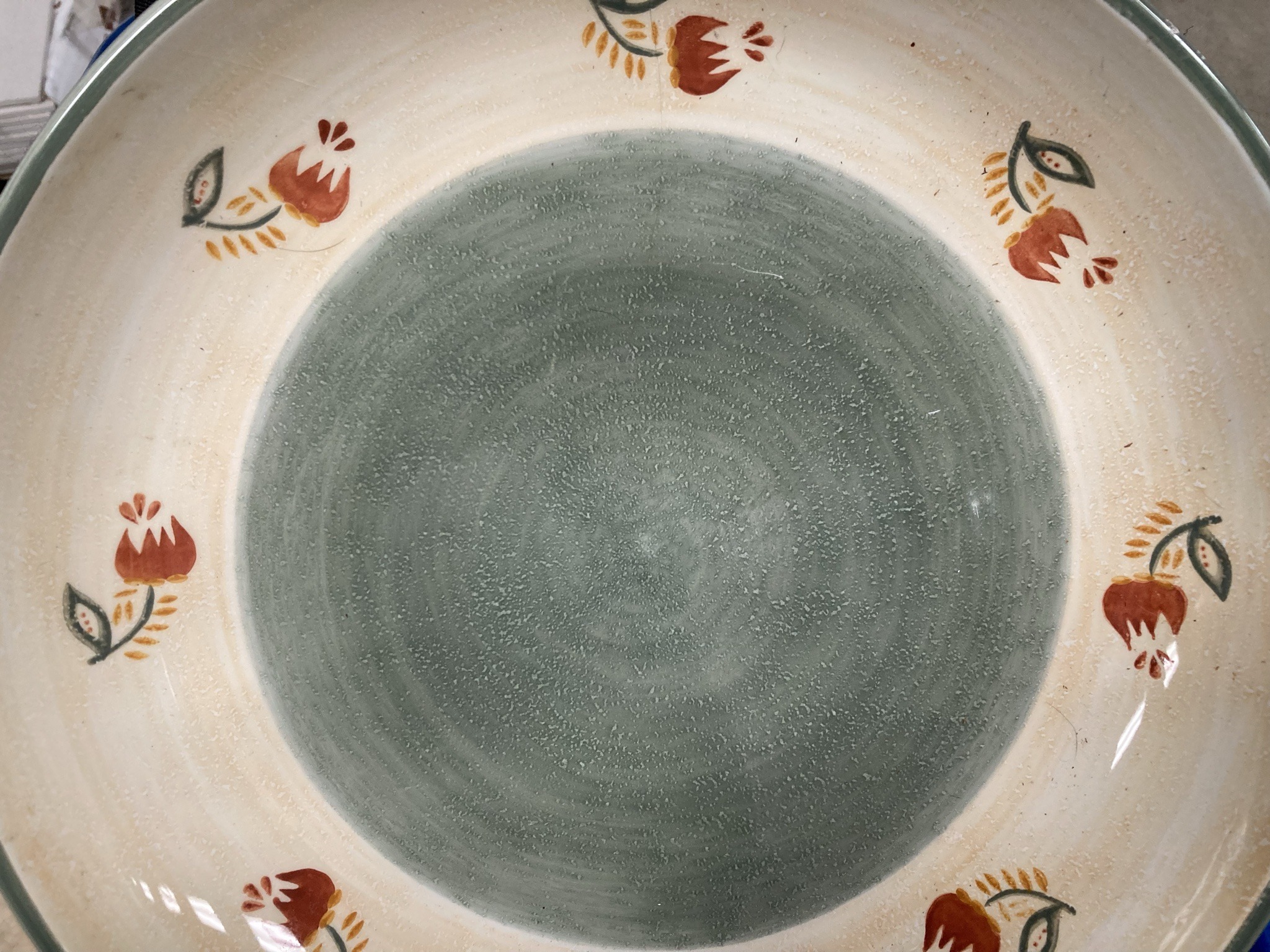 This item is a decorative ceramic low-rimmed basin or large bowl, characterized by its rustic, hand-crafted folk art aesthetic. Physically, the piece features a center medallion finished in a muted sage-green glaze with a textured, speckled finish, possibly achieved through a sponge or stipple application. The surrounding ivory or cream-colored interior wall is decorated with a repeat pattern of hand-painted floral motifs resembling stylized tulips or pomegranates. These motifs are executed in deep terra-cotta or burnt orange tones with olive green stems and yellow-gold hatched accents. The rim is finished with a matching olive-green band that frames the piece. In terms of construction, the ceramic body appears thick and durable, typical of mid-century to late 20th-century artisanal pottery. Visible condition issues include fine surface scratches in the central green glaze, suggesting use as a serving or display vessel. There is a noticeable hairline crack originating from the top edge, running vertically through the cream wall toward the center. Small dark inclusions are visible in the glaze, which are likely firing kiln specks characteristic of handmade stoneware. The style suggests a Mediterranean or Central European influence, likely dating from the 1970s to the 1990s. The brushwork is deliberate but expressive, indicating a skilled artisan rather than mass production.