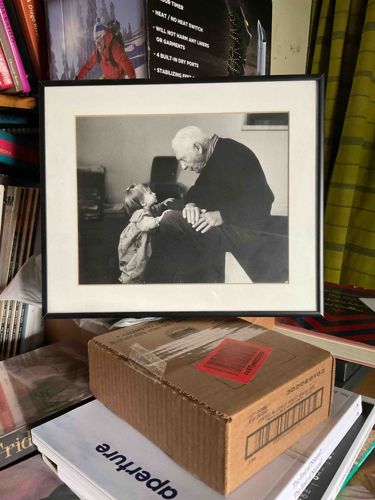 This item is a professionally matted and framed black and white silver gelatin or high-quality inkjet photographic print. The central image depicts a poignant candid moment between an elderly Caucasian man and a toddler. The man is seated, leaning forward with his hands on his knee, looking down with a gentle expression at the young child standing before him. The photograph utilizes a shallow depth of field, focusing sharply on the two subjects against a soft-focus interior background. The print is housed behind glass within a slim, modern black composite or metal frame. It features a wide, off-white or cream-colored archival-style mat with a visible inner bevel, likely gilded or contrasting in a light gold tone. The physical condition appears excellent from the front, with no visible foxing, silvering, or water damage to the paper. The frame and glass appear free of significant scratches or chips. Based on the filmic quality and the subjects' attire, the photograph appears to be from the late 20th century. The composition suggests professional-grade photography, emphasizing emotional narrative through natural lighting and high-contrast tonal range.