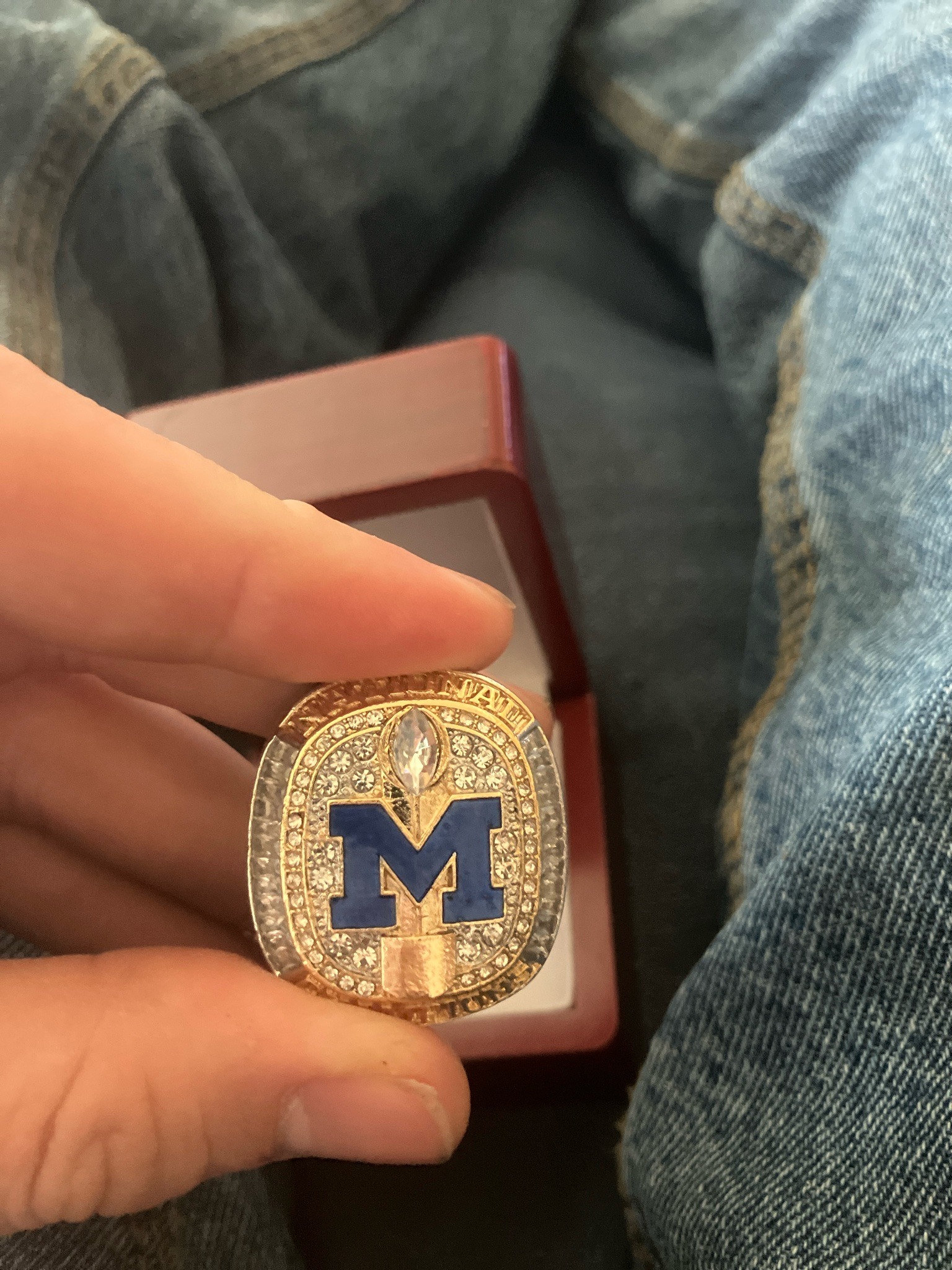 This item is a commemorative championship ring fashioned after those awarded to the University of Michigan Wolverines football team. The ring features a top face dominated by a large 'Block M' logo in blue enamel, set against a background of brilliant-cut clear cubic zirconia or glass 'diamonds.' Atop the 'M' sits a stylized football trophy icon, likely representing the College Football Playoff trophy. The bezel is inscribed with text, including the word 'NATIONAL' along the upper curve. The ring is constructed from a gold-toned alloy with silver-toned accents on the shoulders. Physically, the ring is oversized and bulky, typical of modern championship jewelry. It appears to be a fan-grade replica or high-quality souvenir rather than an authentic player ring, as indicated by the simplified detailing and the standard retail-style cherry wood finish presentation box visible in the background. The condition appears to be excellent with no missing stones or significant tarnishing, showing a high-luster finish. The craftsmanship is clean for a commercial commemorative piece, though it lacks the fine jewelry hallmarks like 10k or 14k gold stamps often found on authentic team orders. The style corresponds to the current 2023-2024 championship era, emphasizing bold branding and high-contrast color materials.