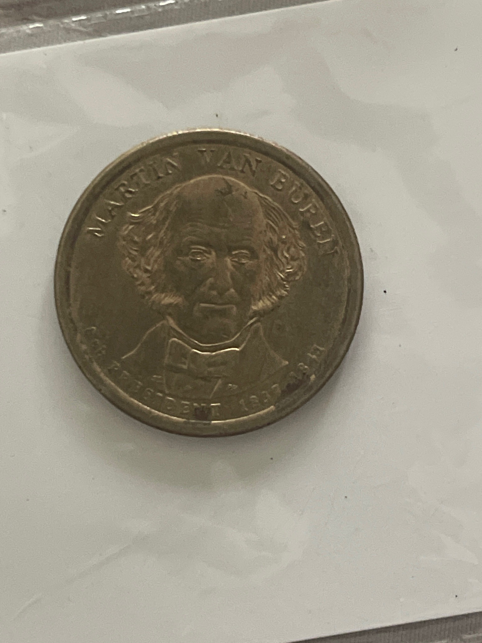 This item is a 1-ounce silver commemorative medal featuring the portrait of Martin Van Buren, the 8th President of the United States. The obverse displays a high-relief bust of Van Buren in three-quarter view, characteristic of 19th-century presidential portrait style. Centered above the portrait is the name 'MARTIN VAN BUREN' in capital block letters, while the lower perimeter is inscribed with '8TH PRESIDENT' and his years in office, '1837-1841'. The medal appears to be struck in .999 fine silver with a metallic, slightly golden-toned patina, likely due to surface oxidation or environmental exposure within its protective flip. The edge is reeded, suggesting a bullion or numismatic production. The condition shows moderate handling; there are visible surface scratches ('hairlines') across the field and on the high points of the portrait, specifically on the cheek and forehead. Minor rim dings are present at the bottom edge. While it resembles a coin, the lack of a legal tender denomination identifies it as a private mint medal or a commemorative bullion round. The reverse is not visible, but typically such pieces would state the weight and purity of the metal. The craftsmanship indicates a proof-like finish that has dulled over time.