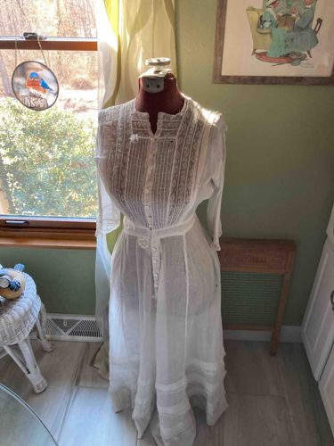 This is an authentic Edwardian-era (circa 1900-1910) lingerie dress, also known as a tea dress, displayed on a vintage dress form. The garment is constructed from fine, semi-sheer white cotton batiste or lawn. It features an intricate bodice decorated with vertical panels of delicate insertion lace and pleated tucks, creating a refined texture. The dress has a high, stand-up mandarin-style collar also trimmed with lace. The front is detailed with a long row of small mother-of-pearl or fabric-covered buttons extending from the neckline through the gathered waistline. The sleeves are three-quarter length with matching lace trim at the cuffs. The skirt is full-length and flows into a soft flare, accented with horizontal pintucks and a tiered lace hemline. Overall construction shows high-quality period craftsmanship with fine stitching. Given its age, the fabric appears generally well-preserved, though a small dark spot or pinhole is visible on the upper left chest area. There is some minor discoloration consistent with the patina of antique textiles. The silhouette is characteristic of the 'S-bend' or 'Gibson Girl' era, requiring a corset for the intended period fit.