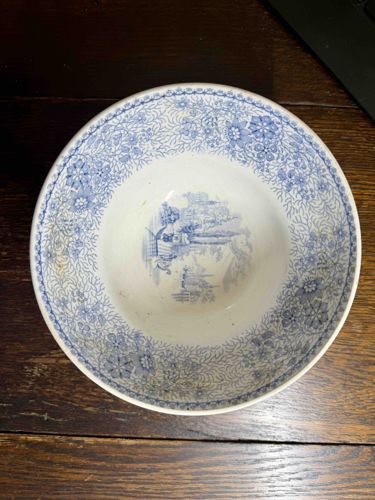 This is an antique or vintage ceramic soup plate or shallow bowl, measuring approximately 7 inches in diameter and 3.75 inches in depth according to the provided context. The item features a classic blue and white transferware decoration. The central motif depicts a pastoral or scenic landscape, likely an oriental-inspired 'Willow pattern' or a similar theme, showcasing buildings (possibly a pagoda or house), trees, and what appears to be water or a bridge. The imagery is finely detailed, rendered in a consistent medium-blue tone against a stark white ceramic base. Surrounding this central design, the rim of the bowl is adorned with a dense, intricate border pattern consisting of floral elements, possibly chrysanthemums or similar stylized flowers, interspersed with delicate scrolling foliage. This border pattern extends from the inner edge of the rim almost to the lip of the bowl. The color palette is characteristic of early to mid-19th to early 20th-century transferware, often made from earthenware or ironstone. Visible condition issues include a general patina consistent with age and use, some discoloration or staining, particularly in the central white area of the bowl, and potentially some crazing not clearly discernible from the image but often present in older ceramic pieces. There are no obvious chips, cracks, or repairs visible in the provided image. The craftsmanship appears to be of good quality, typical of mass-produced yet aesthetically pleasing household ceramics of its era.