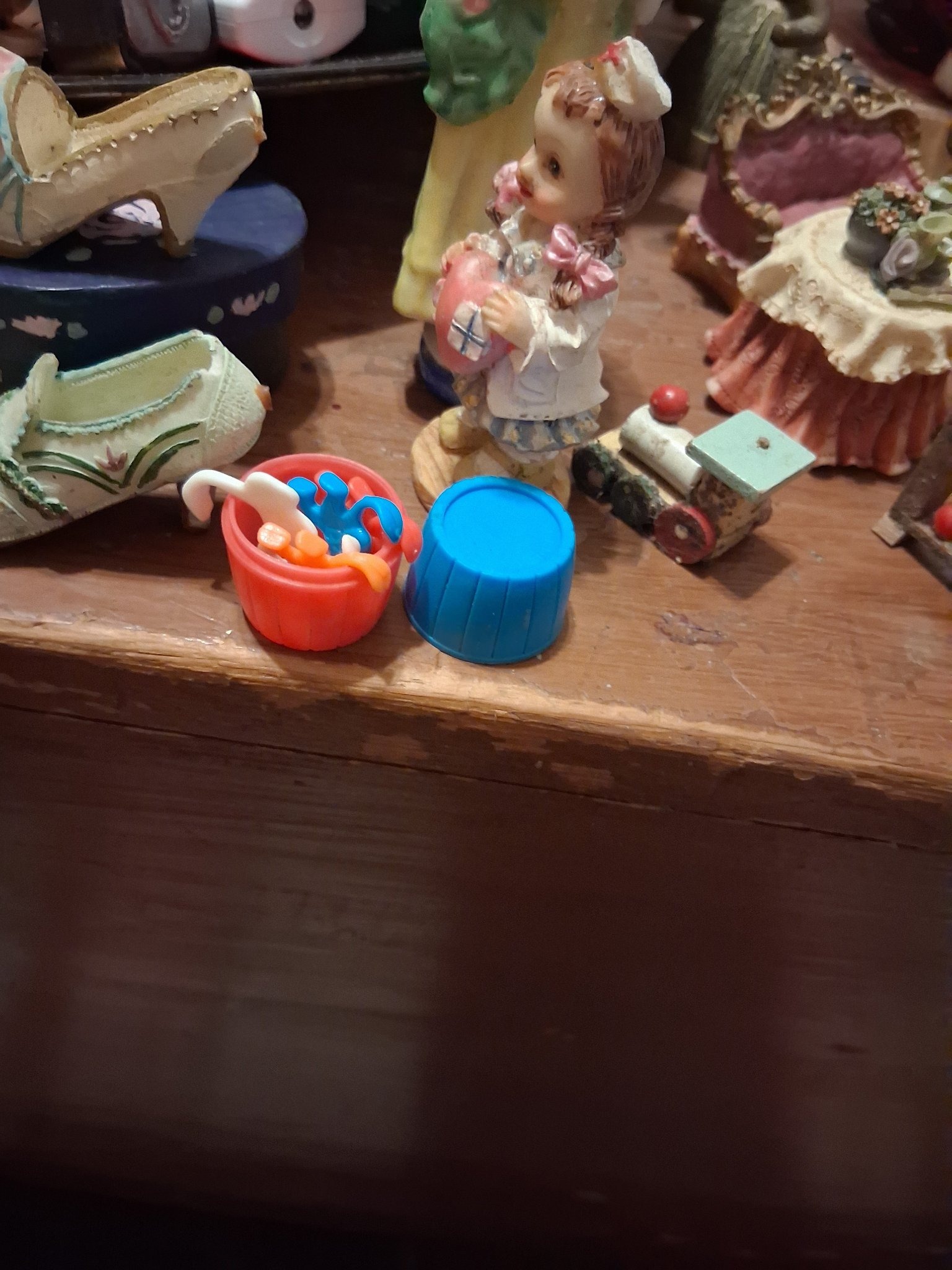 This diminutive figurine depicts a young girl dressed in a white medical-style jacket or pinafore over a blue patterned dress, accessorized with pink bows in her hair. She is holding a large, stylized pink heart decorated with a medical symbol. The piece is crafted from a cast resin or cold-cast porcelain, featuring a matte finish and hand-painted details. It stands on a circular, sandy-textured base. The figurine is approximately 3 to 4 inches in height. The craftsmanship reflects a late 20th-century decorative style (circa 1980s-1990s), common in giftware items meant for sentimental display. Notable features include the detailed textures of the clothing and hair, as well as the 'nurse' style cap. In terms of condition, the piece shows some surface dust and minor discoloration typical of age-related shelf wear, particularly in the crevices of the base and garments. No significant structural damage such as chips or cracks is immediately visible in the current view. The figurine is part of an eclectic collection of small curios and miniatures, including Victorian-style shoes and furniture, suggesting it was likely mass-produced for the collectible gift market. There are no visible maker's marks or signatures from this angle, though such marks are commonly found on the underside of the base in pieces of this type.
